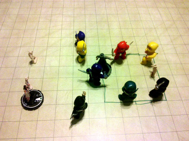 I'm always forgetting to post the photos that are taken at the session. The figures we use always amuse me. P tends to bring his own Hero Clix, and had some Jonah Hex figs this evening. Everyone else generally uses what I have on hand, which is currently figs from the Deadlands Board Game. This session they were in Shan Fan and were fighting Martial Artists, and I used some Colorful Ninjas that I got at a Party Favor Store some time ago. I apologized for the scale mismatch and Back to the Future was quoted, "Please excuse the crudity of this model, I didn't have time to build it to scale or to paint it."